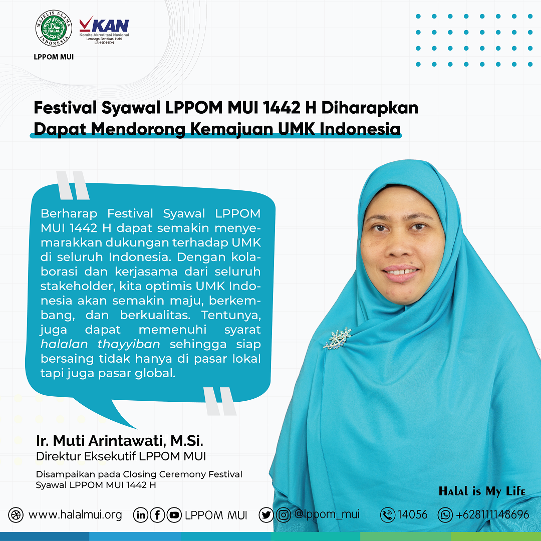 Festival Syawal LPPOM MUI 1442 H yang telah berakhir pada 22 Juni 2021 lalu, diharapkan dapat lebih menyemarakkan dukungan dan kolaborasi seluruh stakeholder halal terhadap UMK di seluruh Indonesia untuk dapat bersaing ke kancah global